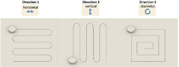 Variable 1, Path, was set to be linear, which refers to a movement that draws straight lines, and a meshed surface, which refers to a movement that draws a surface mesh in zigzags. Variable 2, Speed, was set to three types: 100% speed, 50% speed, and 200% speed. The 100% speed was set to 30 cm/s based on the average speed defined in the product specifications of Roomba, iRobot’s robot vacuum cleaner. To ensure that subjects could recognize the speed change, we set the low (50% of basic speed) to 15 cm/s and the high speed (200% of basic speed) to 60 cm/s. The stimuli in this experiment were designed to isolate movement effects using minimalistic shapes and neutral colors. Here, a 200% high-speed setting was selected to provide a perceptual distinction without appearing excessively fast, ensuring naturalistic applicability (Abramson, 2021). The first row in Table 2 shows the videos for Speed as the variable in the path-linear movement of the experimental stimulus based on the robot vacuum cleaner. The second row shows the videos for Speed in the path-meshed surface movement. The auxiliary lines in the images are intended to help understand and do not exist in the actual experimental videos. Variable 3, Volume, was divided into the basic (100%), small (50%), and large (200%) movement volumes. In the path-linear case, the robot vacuum cleaner moves back and forth in a straight line of 0.9 m, 1.8 m, or 3.6 m, as shown in the third row of Table 2. In the path-meshed surface case, it moves by drawing zigzags in a range of 0.5m2 (0.5m (W) * 1.0m (H)), 1.0m2 (1.0m (W) * 1.0m (H)), or 2.0m2 (2.0m (W) * 1.0m (H)), as shown in the fourth row. Variable 4, Direction, was applied to only the path-meshed surface, and as shown in the last row of Table 2, it is classified into the horizontal zigzags and vertical zigzags, which are regular cleaning modes, and the clockwise rotations, which is a cleaning mode focusing on a designated zone.