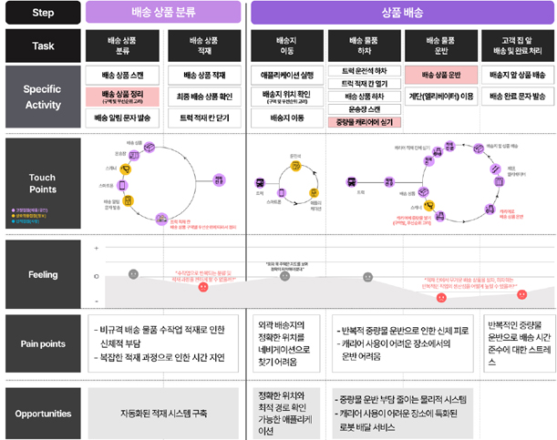 수집된 데이터는 친화도 맵(Affinity Diagram)을 사용해 유사성을 기반으로 체계적으로 분류하였으며, 이를 통해 주요 문제와 패턴을 도출하였다. 또한 분석 결과를 바탕으로 대표 사용자 유형(페르소나)을 정의하고, 배송 과정에서 발생하는 단계별 접점과 문제를 시각화한 고객 여정 지도를 개발하였다. 이러한 과정은 택배기사의 업무와 경험에서 핵심적인 페인포인트를 명확히 밝히고, 사용자 중심의 AI 기반 로봇 협업 서비스 설계를 위한 기초 자료를 제공하는 데 기여하였다 [Table 7].