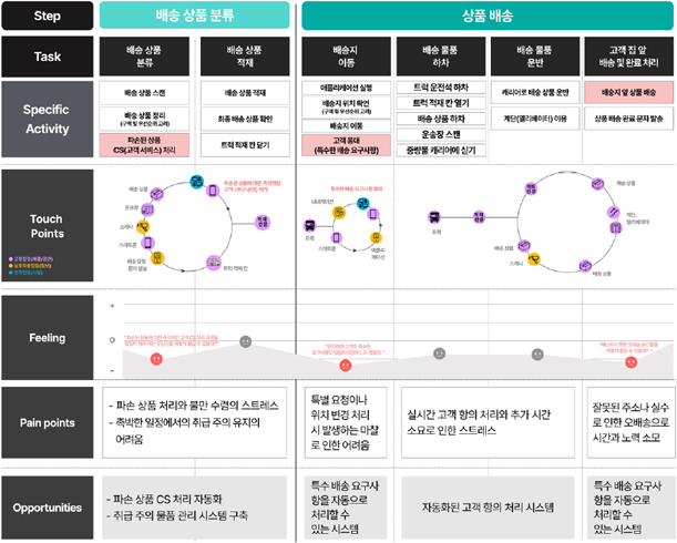 고객 여정 지도에서는 택배기사의 업무 중 라스트 마일 배송 구간을 ‘배송 상품 분류’와 ‘상품배송’의 두 단계로 나누어 고객여정을 분석하였다[Table 13]