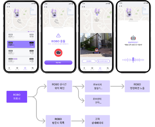 안전 및 예외 상황 대응 측면에서는 AI 로봇이 시각 및 청각 기반의 멀티모달 센서를 통해 충돌, 장애물, 기상 변화 등 다양한 변수에 즉각적으로 반응하고, 축적된 Edge Case 데이터를 기반으로 최적의 대응 전략을 도출한다. 자율적 처리가 어려운 상황에서는 실시간 알람과 함께 택배기사에게 대응 가이드를 제공하며, ROBO 애플리케이션을 통해 음성 또는 텍스트 기반의 간편한 조치가 가능하도록 설계되었다. 더불어, 피드백 기반 학습 시스템은 반복적으로 발생하는 문제 상황을 지속적으로 학습하여 향후 대응 역량을 점진적으로 개선할 수 있도록 지원한다.
