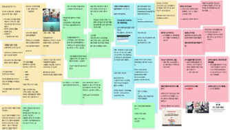 Develop 단계 진행은 도출된 핵심니즈(N1~N9) 항목을 중심으로 문헌연구에 나타난 혁신인자 12개 항목(IF01~12)과 기업 수요조사 3개 관점을 종합적으로 고려하여 각 NTP에 적합한 유무형적 통합시스템으로서의 PSS 아이디어 발굴을 진행하였다. 고객의 요구에 맞게 제품과 서비스가 긴밀하게 연결된 시스템을 의미하는 PSS의 개발을 위해서는 물리적 요소와 서비스 간의 상호작용을 고려한 창의적인 발상이 요구된다(Yi & Yeoun, 2023). 캡스톤디자인은 문제에 따른 새로운 제안을 요구받는다는 점에서 창의성을 높이는 데 효과적이며, 배운 지식을 종합하여 정보의 수집과 분석 및 제안 등 다양한 방식의 문제해결이 요구된다(Huh & Lee, 2021). 창의적 문제해결을 위해 각 팀은 Brainstorming, Customer Journey Map, Storyboard 등의 디자인 발상 도구를 활용해 각 NTP 콘셉트의 경험 시나리오를 도출하였다. 기업전문가 피드백 반영을 통해 콘셉트를 보완하고 정교화 과정을 거쳤다. 하기 [Figure 1~3]은 팀별 발상과정의 작업 예시이다.