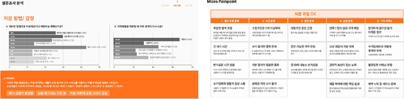 가전제품 사용 후 처리에 대한 MZ세대 경험과 니즈 확인을 위해 130명에 대한 설문조사(M27/F44)를 진행하였다. 주요 결과로는 1)폐가전 결정 및 처분 경험, 2)폐가전 접점 경험, 3)브랜드 재구매 연계 경험이 중요한 혁신 대상으로 나타났다.