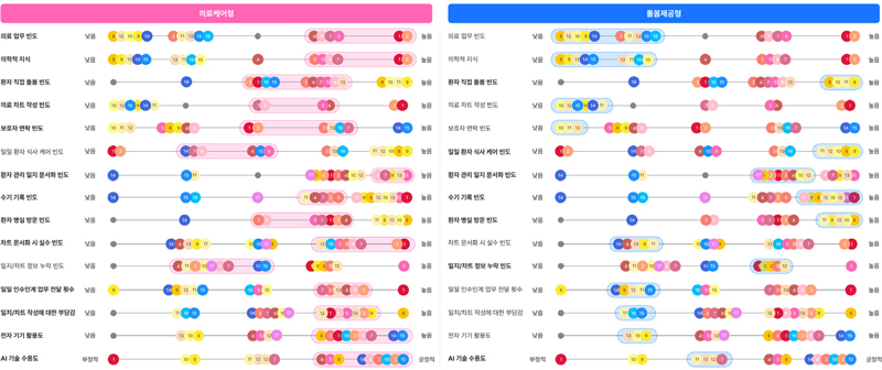 먼저, Table 6의 의료케어형의 여정맵은 의료케어형의 환자 돌봄 과정을 반영하여 ‘병실 라운딩 > 복약 지도 > 일지 및 차트 기록, 정리 > 인수인계’의 순서로 설정하였다. 또한, Table 7의 돌봄제공형의 여정맵은 돌봄제공형의 환자 돌봄 과정을 반영하여 ‘병실 라운딩 > 신체적 케어 > 일지 및 차트 기록, 정리 > 인수인계’의 순서로 설정하였다. 각 단계에서 사용자의 터치포인트와 세부 행동, 돌봄 과정 측면의 페인포인트를 순서대로 작성하였다. 이후, 여정 단계와 세부 과업에 단계별 코드를 부여하여 재정리하였다.