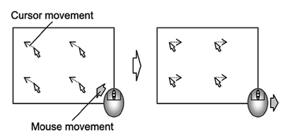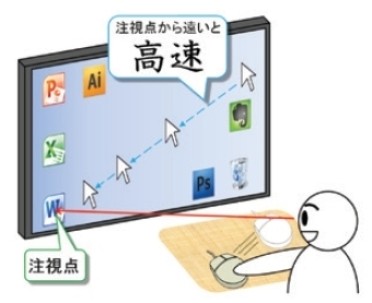 주시 되지 않은 곳의 커서 이동속도 가속화 (山中祥太 et al., 2012) 시선추적장치를 사용하여 주시 되지 않은 곳에서 마우스를 움직일 시 커서 이동속도를 빠르게 조절함 (시선추적장치 이용)