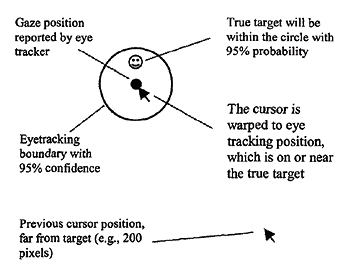 MAGIC Pointing (Zhai, S. et al., 1999) 시선이 향한 영역의 중심으로 커서 이동. 타깃 선택과 커서의 세밀한 이동은 마우스 이용 (시선추적장치 이용)