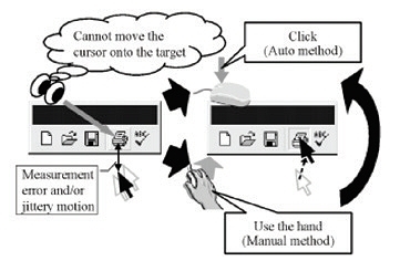 Semi-AUTO (Yamato, M. et al., 2001) 시선으로 커서를 이동시키며 마우스 버튼을 클릭하면 가장 가까운 타깃이 선택됨 (시선추적장치 이용)