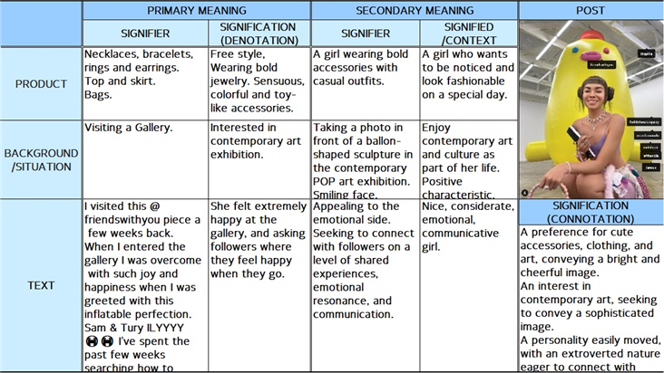 분석 방법으로는 인스타그램에서 가상 패션 인플루언서가 일상성을 활용하여 대중과 소통하는 방식과 게시글에 내재된 의미를 파악하기 위해 기호학적 관점에서 게시글들의 의미를 분석하고, 일상성의 요소에 따라 분류하였다. 즉, 포스팅의 구성 요소 중 제품, 배경 및 상황 등의 이미지 데이터와 해쉬태그, 설명 등의 텍스트 데이터를 수집하여, 롤랑 바르트의 기호 의미 작용 모델을 사용하여 기표를 바탕으로 1차 외시적 의미를 도출하고 이를 통해 2차 의미인 공시적 의미를 Table 2와 같은 프레임워크를 통해 도출하였다.